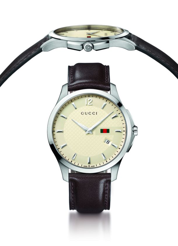 Die G-Timeless Slim ist mit Leder- oder Edelstahlarmband erhältlich. Zifferblätter gibt es in anthrazit oder elfenbein. Ergänzt wird das Design durch zahlreiche typische G-Timeless-Elemente wie dem grün-roten Webstreifen und dem Gucci-Logo, minimalistische Indizes und konische Zeiger.