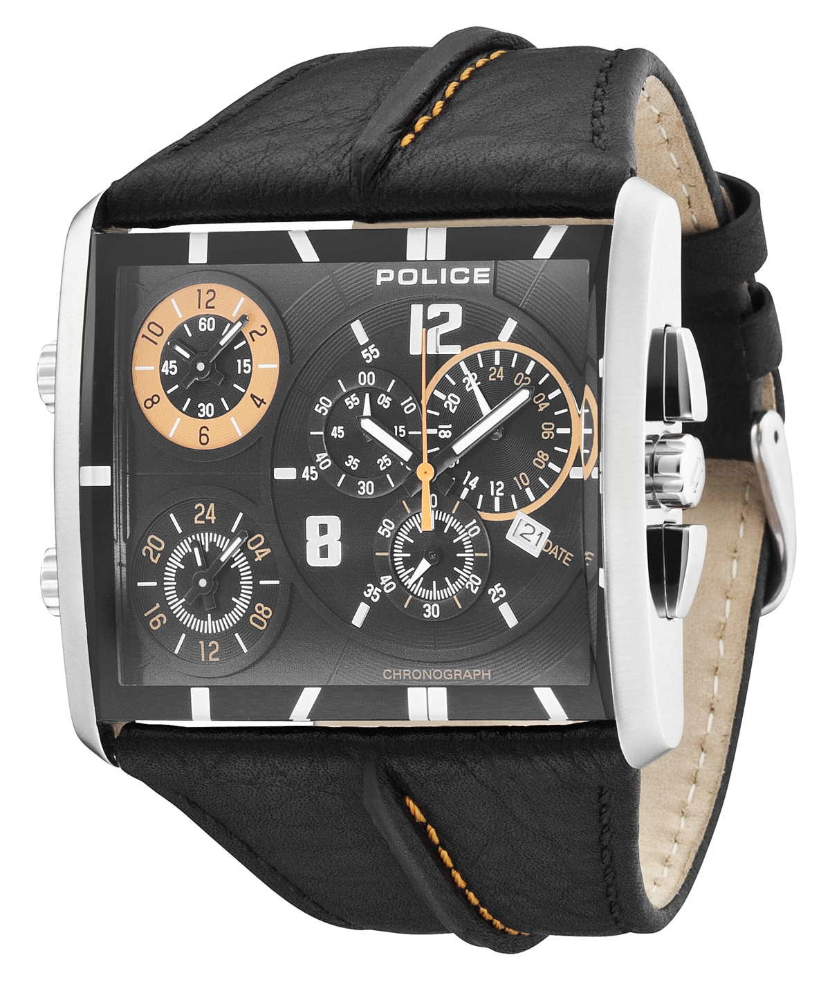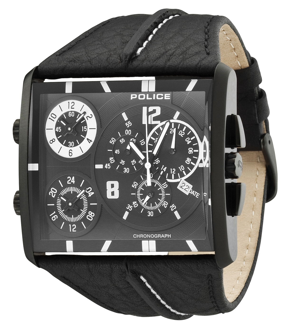 Drei Zeitzonen übersichtlich darzustellen ist gar nicht so einfach. Police hat bei seinem Modell Tripod Chronoden weg gewählt, jeder Zeitzone eine eigene Anzeige zu geben. Eine davon ist zudem mit einem Chronographen ausgestattet, was die Arbeit des Designers nicht gerade erleichtert hat. Das Ergebnis der Überlegungen: ein beeindruckendes rechteckiges Edelstahlgehäuse mit Kantenmaßen von 47 mal 50 Millimetern, die ein spürbares Gewicht mit sich bringen. In dessen bis für Bar druckfesten Inneren arbeiten gleich drei voneinander unabhängige Quarzwerke.