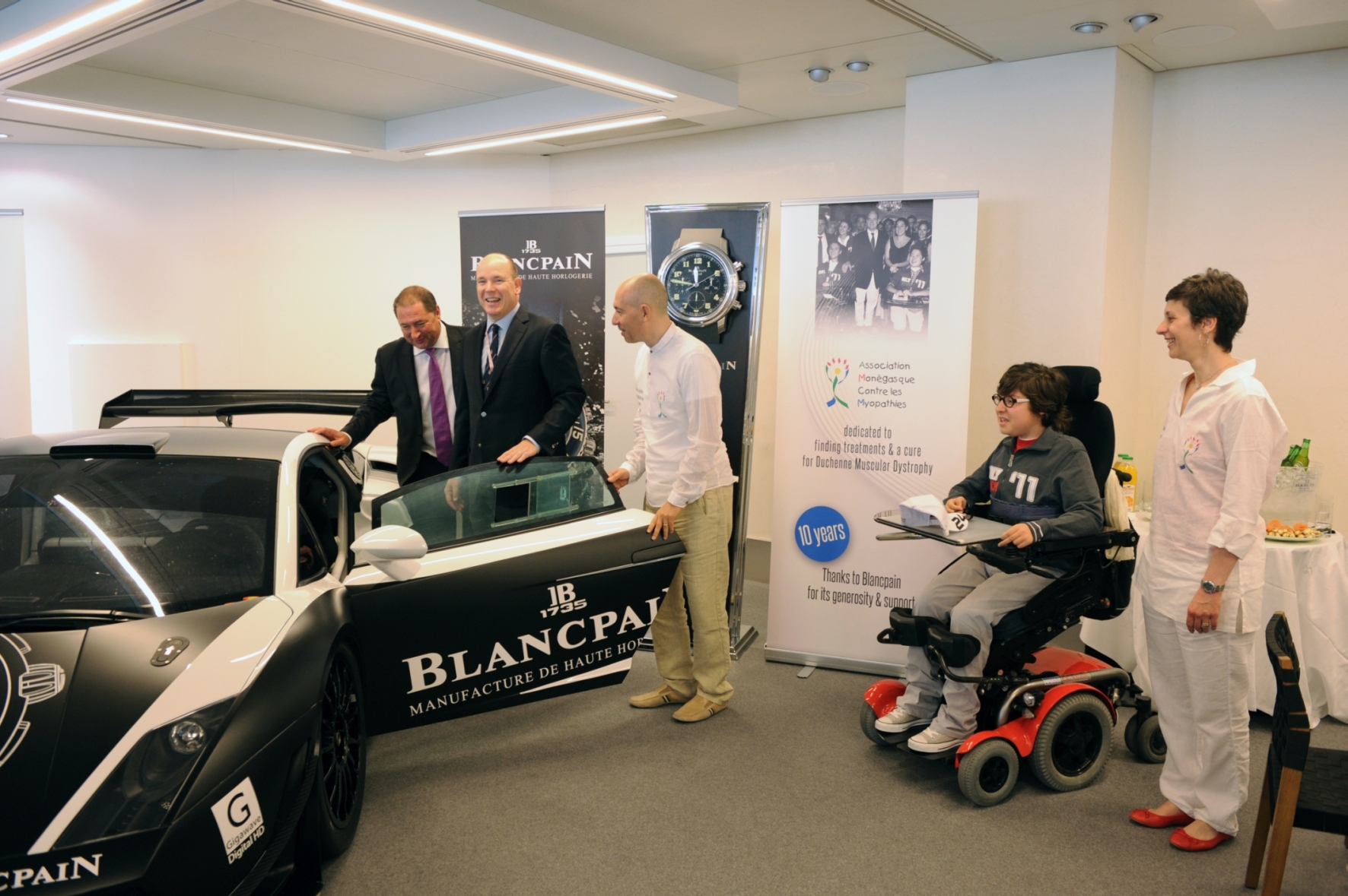 Der Auktions-Erlös des Blancain-Lamborghini geht zu 100 % an AMM: Alain Delamuraz (Vize-Präsident Blancpain), Prinz Alter II von Monaco, Luc Pettavino (Präsident AMM), Paul Pettavino, Monique Pettavino