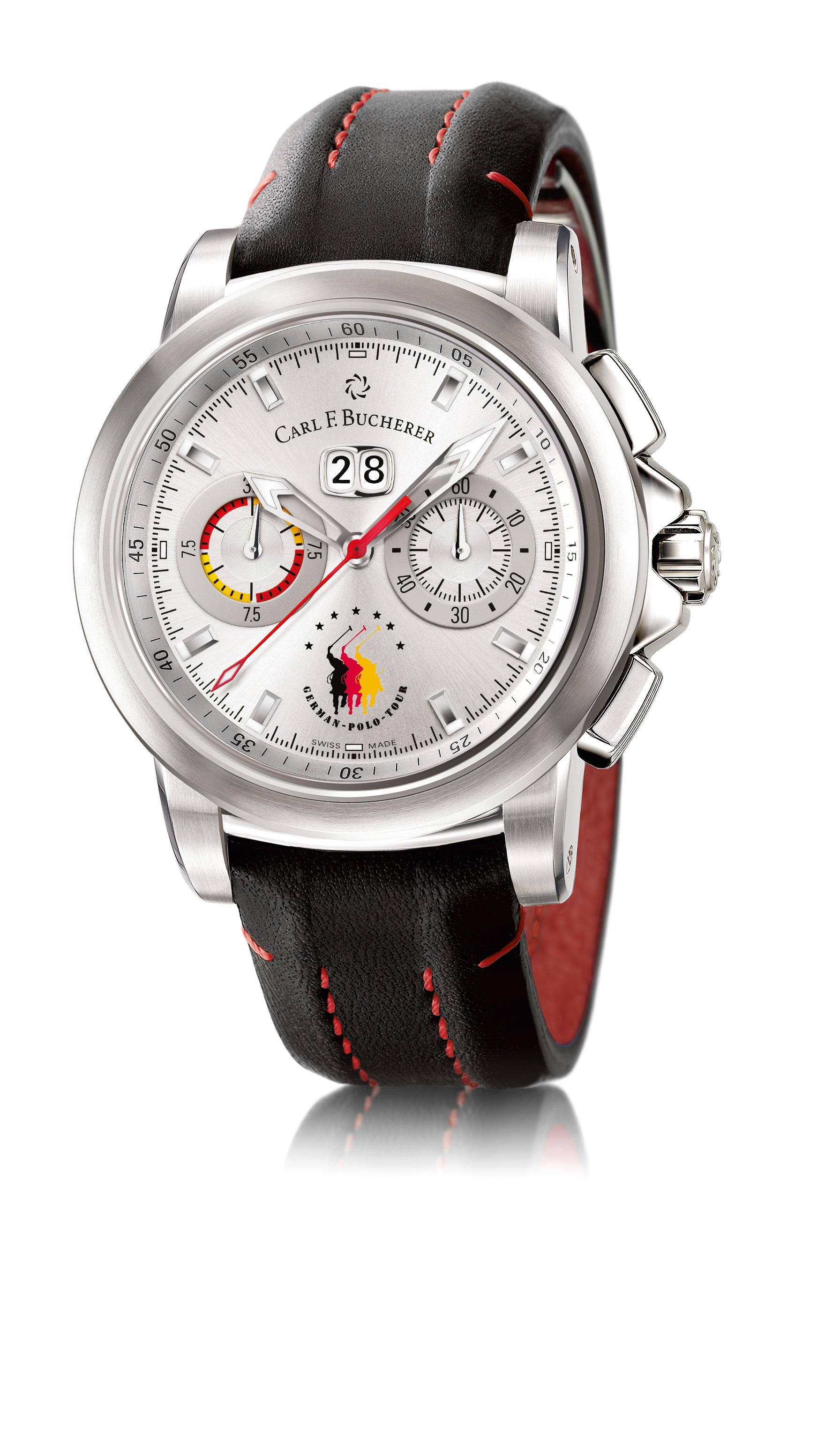 Immer mehr Uhrenhersteller entdecken Polo als Betätigungsfeld – sei es als Sponsor oder auch mit Sondermodellen. Ganz speziell für Polofans in Deutschland hat nun Carl F. Bucherer eine auf 100 Exemplare limitierte Edition der Patravi ChronoDate auf den Markt gebracht. Im Gegensatz zum Serienmodell trägt die Polo Edition das Logo der German Polo Tour bei sechs Uhr. Für Polospieler interessant ist auch ein Designdetail beim Totalisator der Stoppminute bei neun Uhr: Hier sind vier Segemente abwechselnd Rot und Gelb umrandet. Jedes Viertel misst exakt 7,5 Minuten, also genau solang wie ein Chukka im Polo maximal dauert. Mit einem Blick aufs Handgelenk ist die Restdauer des Spieles also mühelos erkennbar.