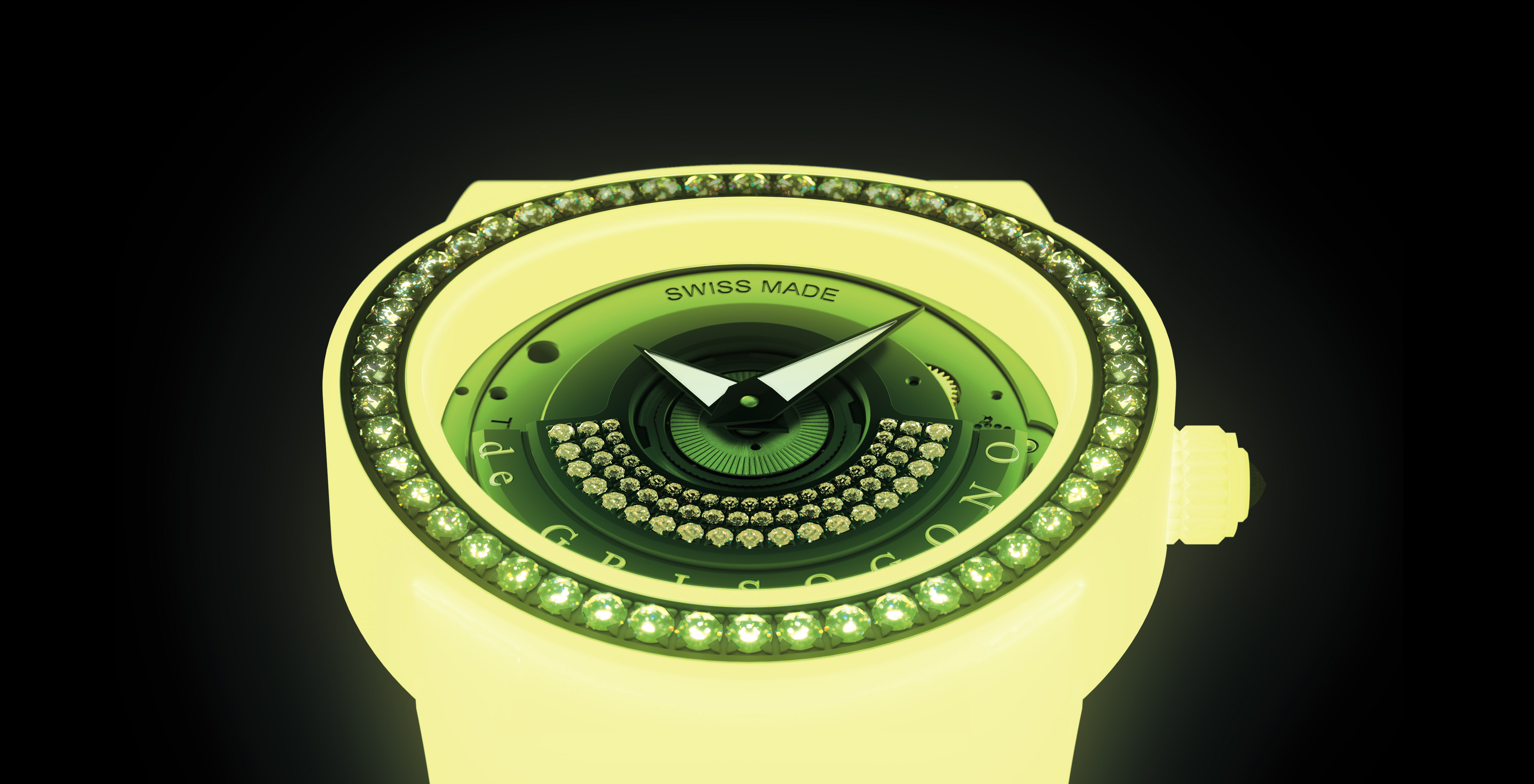 Doch erst bei Nacht entfaltet die neuen Modelle ihre ganze Pracht, die ihr zum Namen Tondo By Nightverholfen hat. Denn für das Gehäuse und die Schließe setzt de Grisogono auf PLF (pearly photoluminescent composite fiberglas). Das neuartige Material mit feinen Perlmutteinschlüssen, speichert im Laufe eines Tages Sonnenlicht und gibt dieses dann bei Dunkelheit glamourös wieder frei. Ein schwarzer Diamant auf der Krone und ein Perlrochenband – ebenfalls farblich passend – runden den Auftritt der Tondo By Night ab.