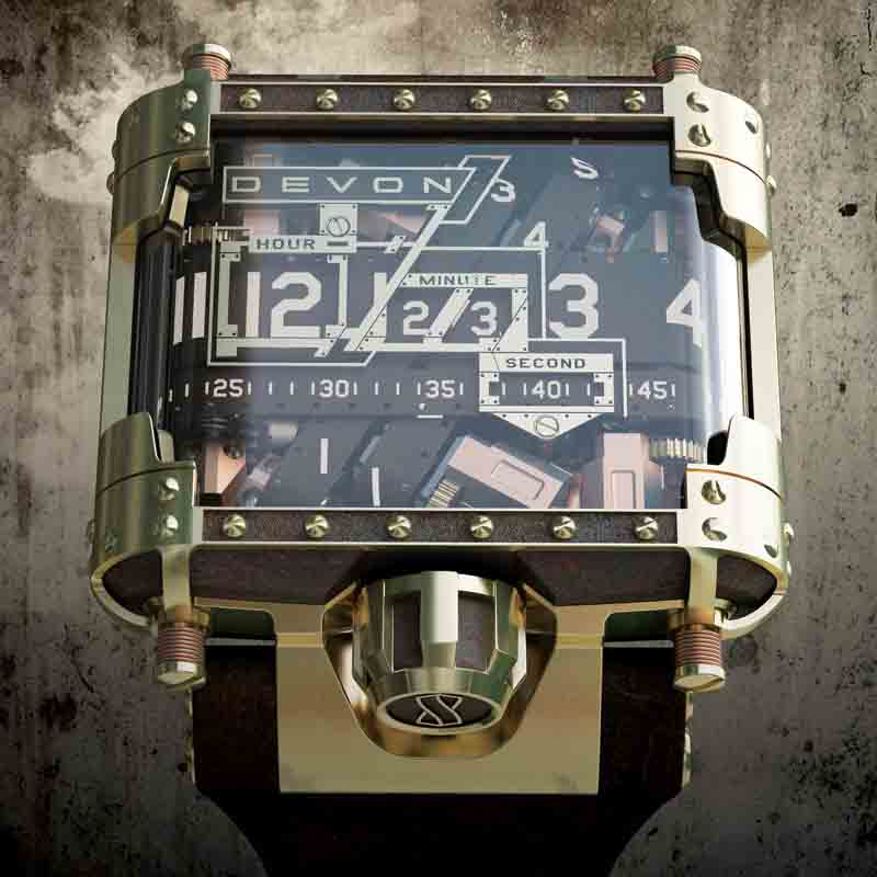 „Wenn Sie es lieben Räder, Zahnräder und Getriebe bei ihrer Arbeit zuzusehen, so wie ich, dann dauert es nicht lange bis man den Zusammenhang zum Designgenre der Steampunk herstellt und den Victorianischen Fantasien, die sie herbeizaubert“, erklärt Scott Devon. Obwohl die Steampunk der normalen Tread in Größe und Anordnung ähnelt, ist sie sofort als etwas Besonderes erkennbar. Sie misst 50 x 18,5 Millimeter und das Außengehäuse ist bronzebeschichtet, sogenannte „body armor“ (Körperrüstung), ein Begriff, den Devonss Chefingenieur, Jeff Stephenson, kreierte, weil die Art der Verkleidung das Original-Gehäuse der Tread 1 schützt. Dieser Körperpanzer ist ein komplettes System von Einzelteilen, die durch vielfache Nieten betont werden, wie auch durch Schrauben und Beschläge die aus einem angenehm kontrastreichen Mix aus Messing und Bronze Finishs bestehen. Phosphorbronzene Federabstandshalter sind in den vier Ecken der „Rüstung“ angebracht, und tun das Ihrige, um die Ästhetik der Steampunk noch zu vertiefen. Dieses schöne Erscheinungsbild setzt sich im Innern des Gehäuses fort.