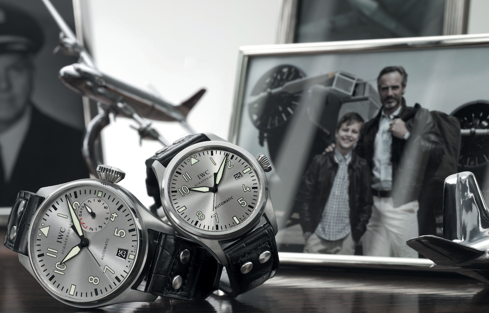 Zum zweiten Mal nach 2008 hat IWC eine Vater-Sohn-Sonderedition lanciert. Diesmal hat die Schaffhauser Uhrenmanufaktur die Große Fliegeruhr für den Vater und die Mark XVI für den Sohn in das Familienpaket gepackt. Das technische Innenleben der beiden Uhren unterscheidet sich zwar gewaltig, doch optisch sind die Verwandtschaftsbeziehungen der beiden Modelle unverkennbar: Beide Uhren werden im Edelstahlgehäuse mit markanter Krone und schwarzem, vernietetem Armband aus Alligatorleder geliefert. Die schwarz eingefassten Zeiger erinnern in ihrer Form an Propellerblätter. Sie sind innen mit grüner Leuchtmasse ausgelegt und bieten auf dem rhodinierten Zifferblatt eine optimale Ablesbarkeit. Die Große Fliegeruhr ist mit Faltschließe, die Fliegeruhr Mark XVI mit Dornschließe oder gegen Aufpreis auch mit Faltschließe erhältlich.