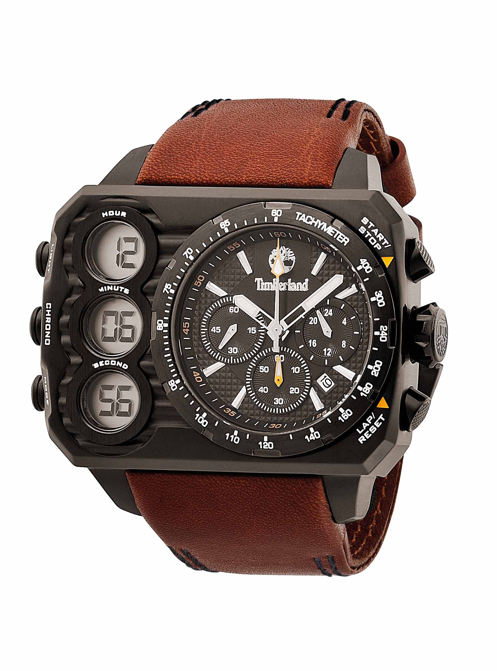 Mit einem Gehäusemaß von 56 mal 56 Millimetern lässt sich die HT3 von Timberland wahrlich kaum übersehen. Den dadurch zu Verfügung stehenden Raum haben die Designer damit genutzt, die Uhr mit einer erklecklichen Anzahl von Anzeigen und Funktionen auszustatten. Denn neben einer konventionellen Zeitanzeige mit Chronographenfunktion gibt es drei weitere digitale Totalisatoren, mit denen sich optional die Zeit messen oder eine zweite Zeitzone darstellen lässt. Zahleiche Knöpfe an der Gehäuseflanke dienen der Steuerung der Uhr. Auch hier haben die Designer den Platz genutzt und Funktionserläuterungen auf dem Edelstahlgehäuse angebracht.