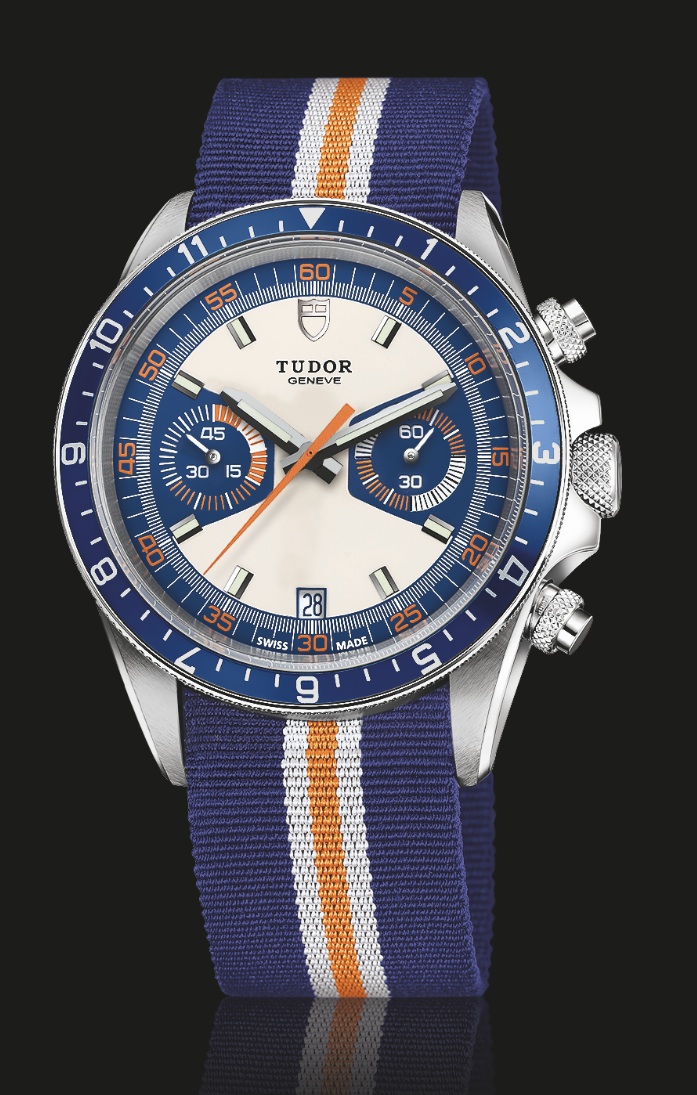 In diesem Jahr waren die 70er dran. Und in diesen findet sich im Jahr 1973 eine Uhr die von Sammlern den Spitznamen „Monte Carlo“ erhalten hat. In der Version des Jahres 2013 heißt die Uhr nun Heritage Chrono Blue. Der Name bezeichnet auch schon zwei zentrale Eigenschaften. Zum einen die Chronofunktion, die heute auf dem Kaliber 2892 beruht. Das stammt in seinen Grundzügen aus dem Fundus der Eta, wird aber bei Tudor mit dem Zeitmessefunktionen aufgerüstet und kann so Spannen bis 45 Minuten messen.