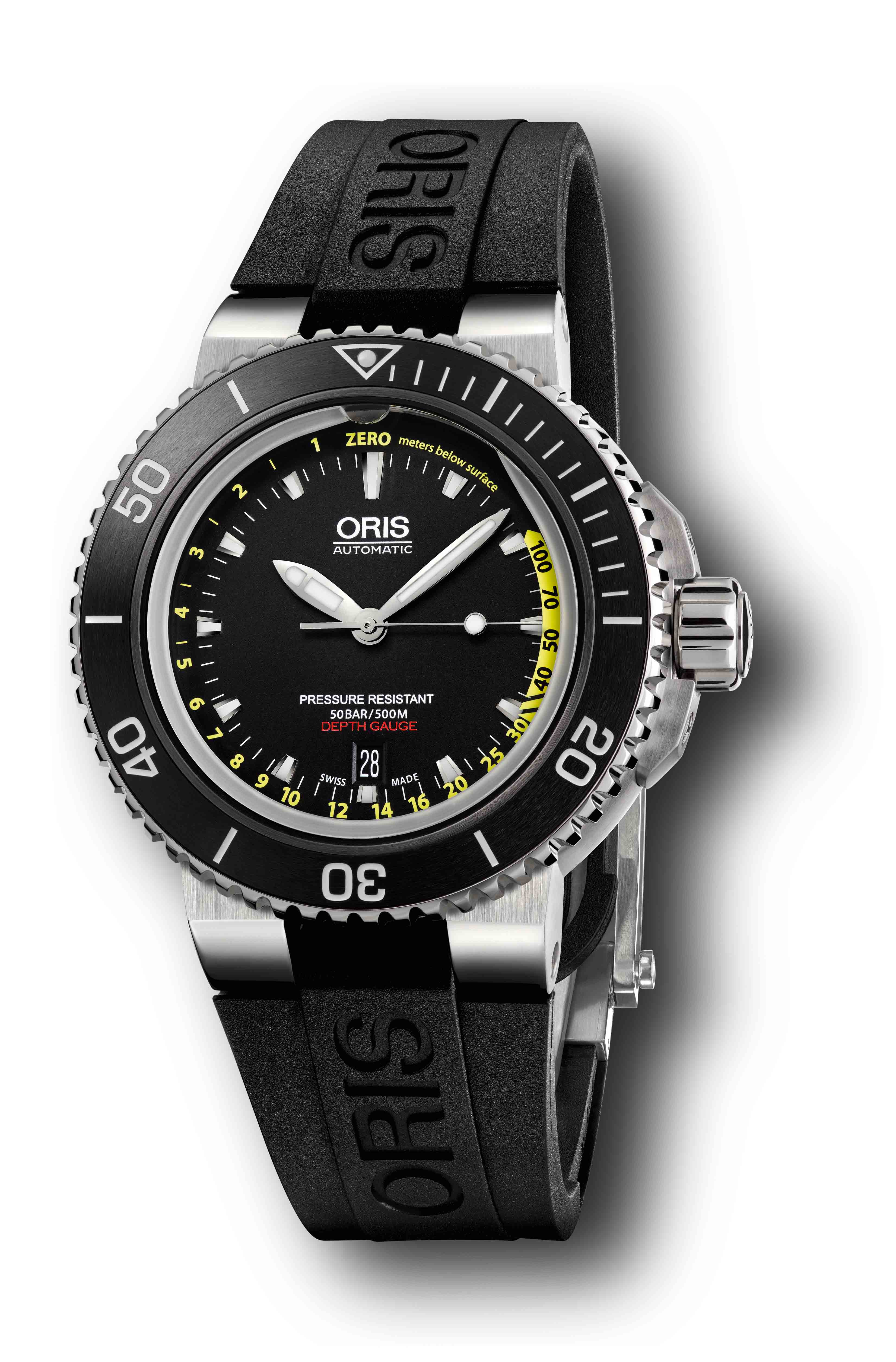 Die Anzeige reagiert sofort und kann ohne Verzögerung die aktuelle und exakte Tiefe darstellen – für Taucher zum Beispiel bei notwendigen Dekompressionspausen besonders wichtig. Das Edelstahlgehäuse verleiht der Uhr einen funktionalen Instrumenten-Look und ist mit der für eine Taucheruhr obligatorischen einseitig drehbaren Lünette mit schwarzer Keramikeinlage versehen. Die Aquis Depth Gauge ist bis 50 Bar druckfest, was für die meisten Taucheinsätze mehr als ausreichend ist. Für den Antrieb der Uhr sorgt das Automatikkaliber 733, das auf dem Sellita SW 200-1 beruht. Verkauft wird die Aquis Depth Gauge in einer wasserdichten Taucherbox, die neben dem Kautschuk- auch ein Metallarmband enthält. Das passende Werkzeug zum Wechseln der Bänder ist ebenfalls enthalten. Das komplette Set kostet 2600 Euro.