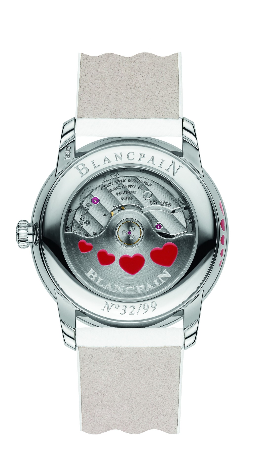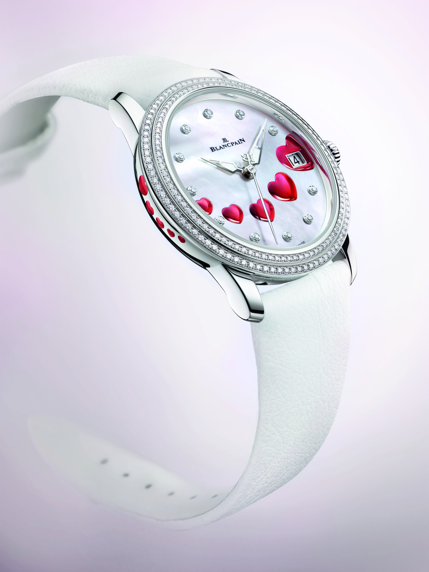 Das für den Valentinstag 2013 entworfene Zifferblatt besteht aus weißem Perlmutt und ist mit Diamantindexen geschmückt. Fünf rotlackierte Herzen in Form von Perlmuttintarsien sorgen mit ihrem packenden Volumen für eine leuchtende farbige Note. Dieses Zusammenspiel von Formen und Materialien ist selbstverständlich in den hauseigenen Werkstätten von Blancpain gefertigt.