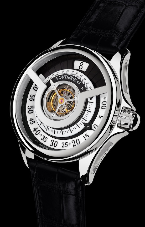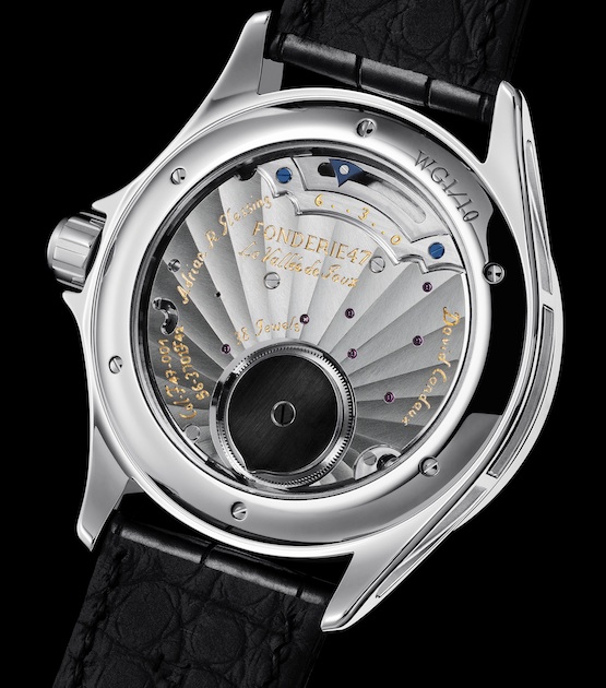 Inversion Principle heißt ein Uhrenmodell, dass von Adrian Glessing entworfen und von David Candaux (Du Val Des Bois) entwickelt und exklusiv für die Stiftung Fonderie 47 und gefertigt wurde. Fonderie 47 wurde im Jahr 2009 mit dem Ziel gegründet, die enorme Anzahl der Sturmgewehre in Afrika zu reduzieren. Dabei steht vor allem das Sturmgewehr AK 47 und dessen Ableger im Fokus, die in Afrika in großer Zahl im Umlauf sind und zu erschreckend niedrigen Preise leicht zu kaufen sind. Von der AK 47 leitet sich auch der zweite Teil des Names der von Peter Thum gegründeten Organisation ab. Und das französischen Wort „Fonderie“ bedeutet „Gießerei“ oder „Schmelzhütte“. Bisher hat Fonderie 47 über 30 000 Sturmgewehre zerstören der umarbeiten können. Denn auch in jedem Modell der Inversion Principle ist ein Teil einer solchen Waffe eingearbeitet: Eine dunkle Platte in Form des Stiftungs-Logos auf dem durch den Glasboden sichtbaren Sperrrad besteht aus dem Metall eines Gewehres. Sozusagen als Beweis ist die Seriennummer der Waffe neben dieser Platte eingraviert.