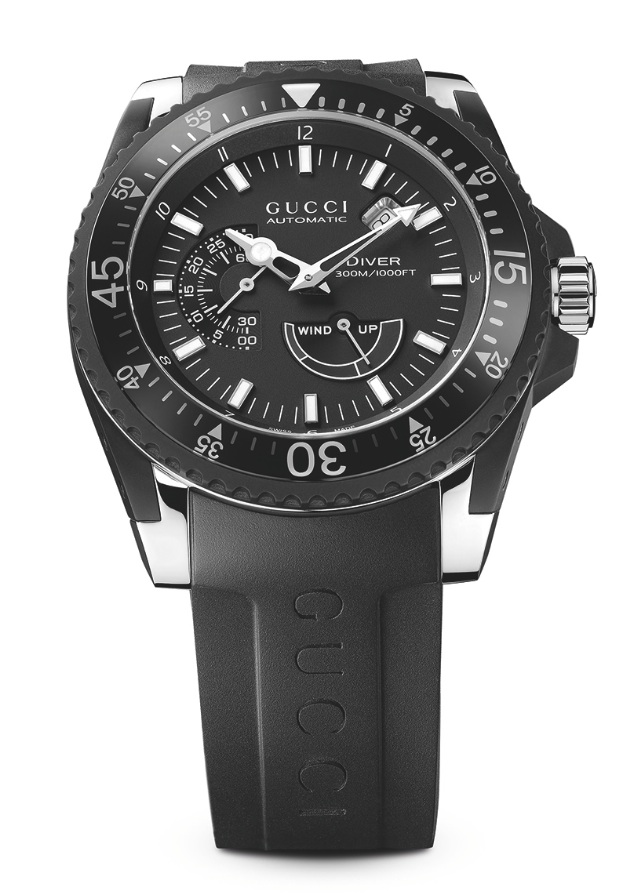 Der Modellname ist eindeutig: Mit der Dive begibt sich Gucci in die Tiefen der Meere. Zudem gibt es in 45 Millimeter messenden Uhr ein Novum: Denn für den Antrieb der Uhr ist das Schweizer Kaliber GP 3300 mit Automatikaufzug und einer Gangreserve von mindestens 46 Stunden zuständig. Dem Kenner verrät die Kaliberbezeichnung, dass hier die Synergieeffekte des PPR-Konzerns genutzt werden, zu dem neben Gucci eben auch Girard-Perregaux gehört. Aus deren hauseigener Werkeschmiede Sowind Manufacture hat nun Gucci das technisch feine Kraftwerkt übernommen. Dieses Vorgehen unterstreicht, dass die Gucci seine Uhrenkollektion im Premium-Segment etablieren will. Ohne allerdings das elegant-modische Auftreten, dass Gucci-Uhren bisher ausgezeichnet hat, zu vernachlässigen.