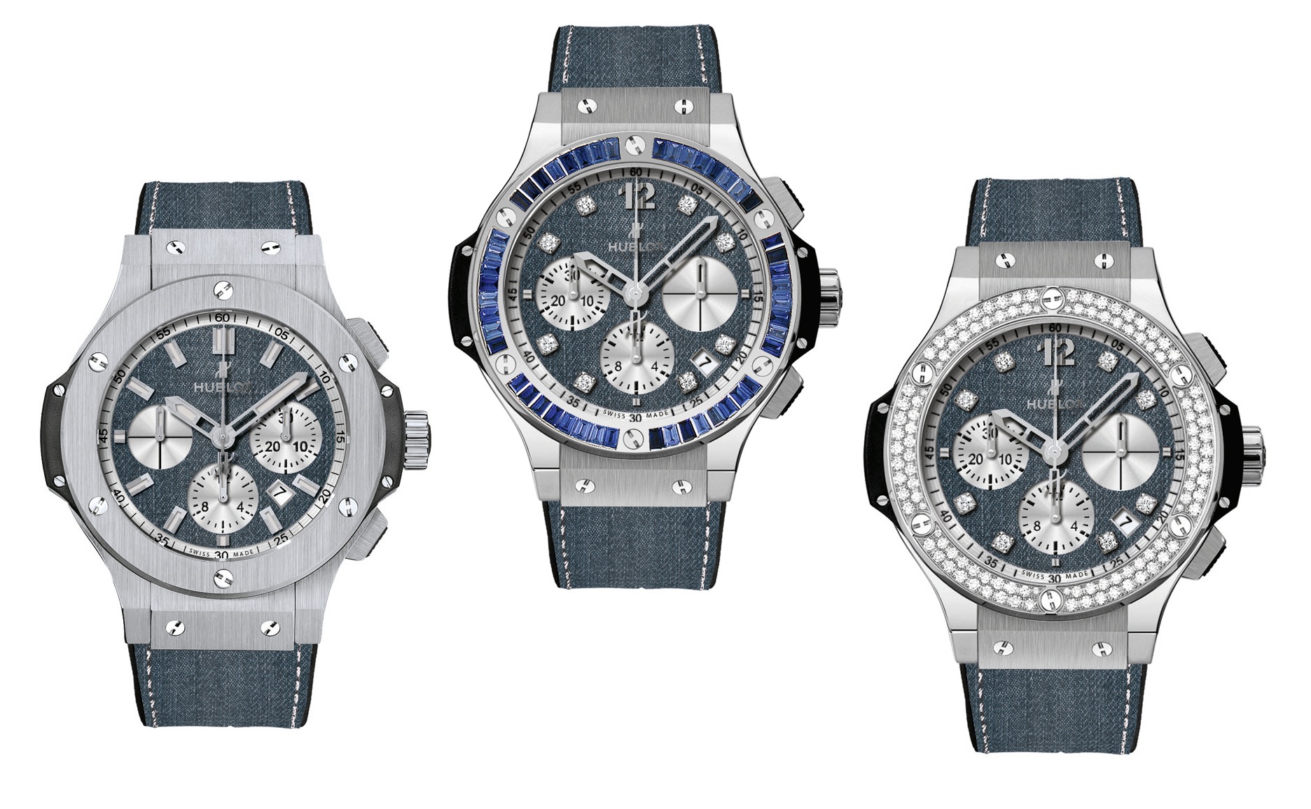 An diesem für Sammler höchst interessierten Konzept ändert sich auch in diesem Frühjahr nicht. Diesmal kleiden die Uhrenbauer aus Nyon als erste Luxusuhrenmarke überhaupt ihre Modelle in Jeans. Selbstverständlich haben sie dabei nicht in irgendeinen Jeansstoff ausgesucht: Das Zifferblatt und das Armband sind aus einem exklusiven italienischen Jeansstoff gearbeitet, hergestellt in einer Manufaktur, die namhafte Luxus- und Modemarken beliefert. Für die Zifferblätter wurde der Stoff dabei unter Vakuum mit Epoxidharz vergossen. Für die Bänder ist er auf schwarzem Kunststoff aufgenäht. Die nach einer Idee von Tina Zegg, Inhaberin von Zegg Hotels & Stores und langjährige Hublot Kooperationspartnerin, entwickelte Kollektion umfasst drei Modelle der Big Bang Jeans für Damen (jeweils auf 250 Exemplare limitiert) eine Hightech-Taucheruhr für Herren, die Oceanographic 4000 Jeans, deren Gehäuse einem Wasserdruck von 400 Bar stand hält. Standesgemäß wurden die Uhren im Hotel Wellness Chasa Montana in Samnaun im Herzen der Schweizer Alpen präsentiert. Ein Stargast war dabei die deutsche Doppelolympiasiegerin und Ski-Weltmeisterin Maria Höfl-Riesch, die seit 2011 Hublot-Botschafterin ist.