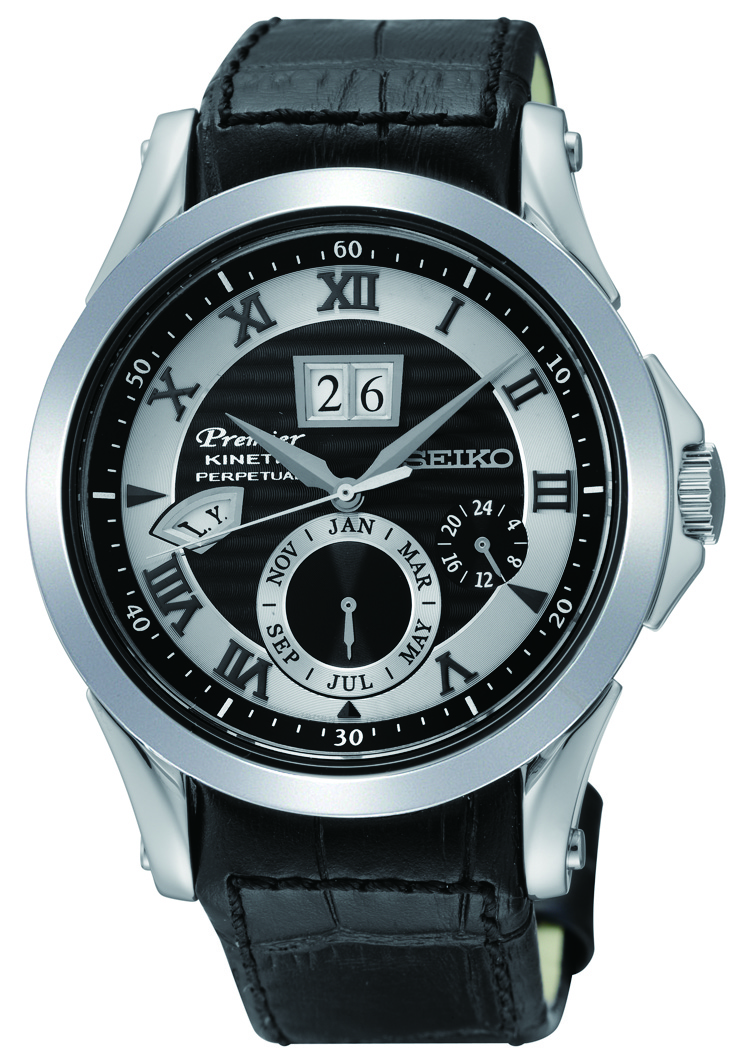 In den beiden neuen Modellen der Kinetic Perpetual Calender vereint Seiko das architektonische Design der Premier-Kollektion jüngsten technologischen Innovationen des Unternehmens.Hightech im eleganten Gewand: Energie für bis zu vier Jahre speichert der Kinetic Perpetual Calender ganz ohne BatterieZum Beispiel die praktische Kinetic-Auto-Relay-Funktion. Sie sorgt dafür, dass die Uhr, falls sie für eine Dauer von mehr als 24 Stunden nicht bewegt wird, in einen Schlafmodus wechselt. Sobald die Uhr wieder angelegt wird, stellen sich die Zeiger automatisch auf die korrekte Zeit. Der Kalender aktualisiert sich währenddessen beständig – und das bis zu vier Jahre lang – ganz ohne Batterie. Denn den Kraftvorrat der Uhr kommt aus einem Mikrogenerator in der Uhr, der einen Automatikantrieb mit einem Quarzmodul kombiniert. Durch die natürliche Armbewegung des Trägers wird in der Uhr eine Schwungmasse in Gang gesetzt, deren Umdrehungsgeschwindigkeit durch ein Räderwerk vergrößert und im Generator in elektrische Energie umgewandelt wird. Damit erzeugt die Uhr die benötigte elektrische Energie selbst.