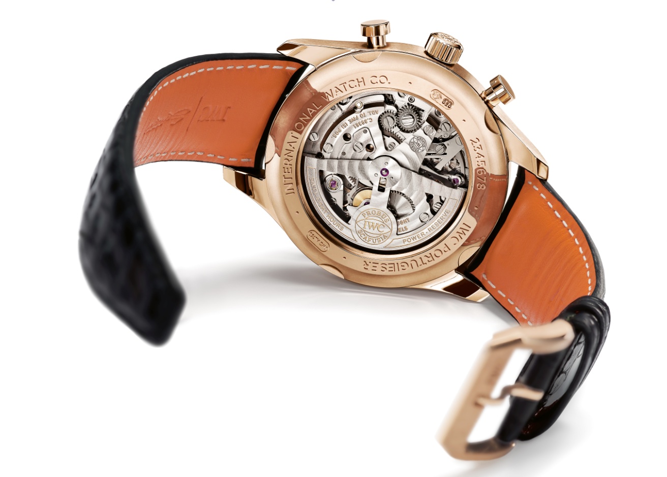 Dessen Konstruktion, die ein ganzes Team von IWC-Entwicklern vier Jahre lang beschäftigte, wurde durch eine revolutionäre Chronographenanzeige erforderlich, mit der man auch längere Messzeiten wie beispielsweise „8 Stunden und 52 Minuten“ auf einen Blick erfassen kann: Dazu wurden im kreisförmigen Totalisator bei der Zwölf Stunden- und Minutenzeiger zusammengefasst, und wirken so wie eine Uhr in der Uhr wirken. Ein Saphirglasboden gewährt freie Sicht auf das Kaliber sowie die mit Genfer Streifen verzierte Schwungmasse. Beim Zifferblatt hat man bei beiden Varianten die Wahl zwischen einer argenté- und einer ardoisefarbenem Version. Alle Modelle werden mit einem Santoni-Armband aus Alligatorleder geliefert.