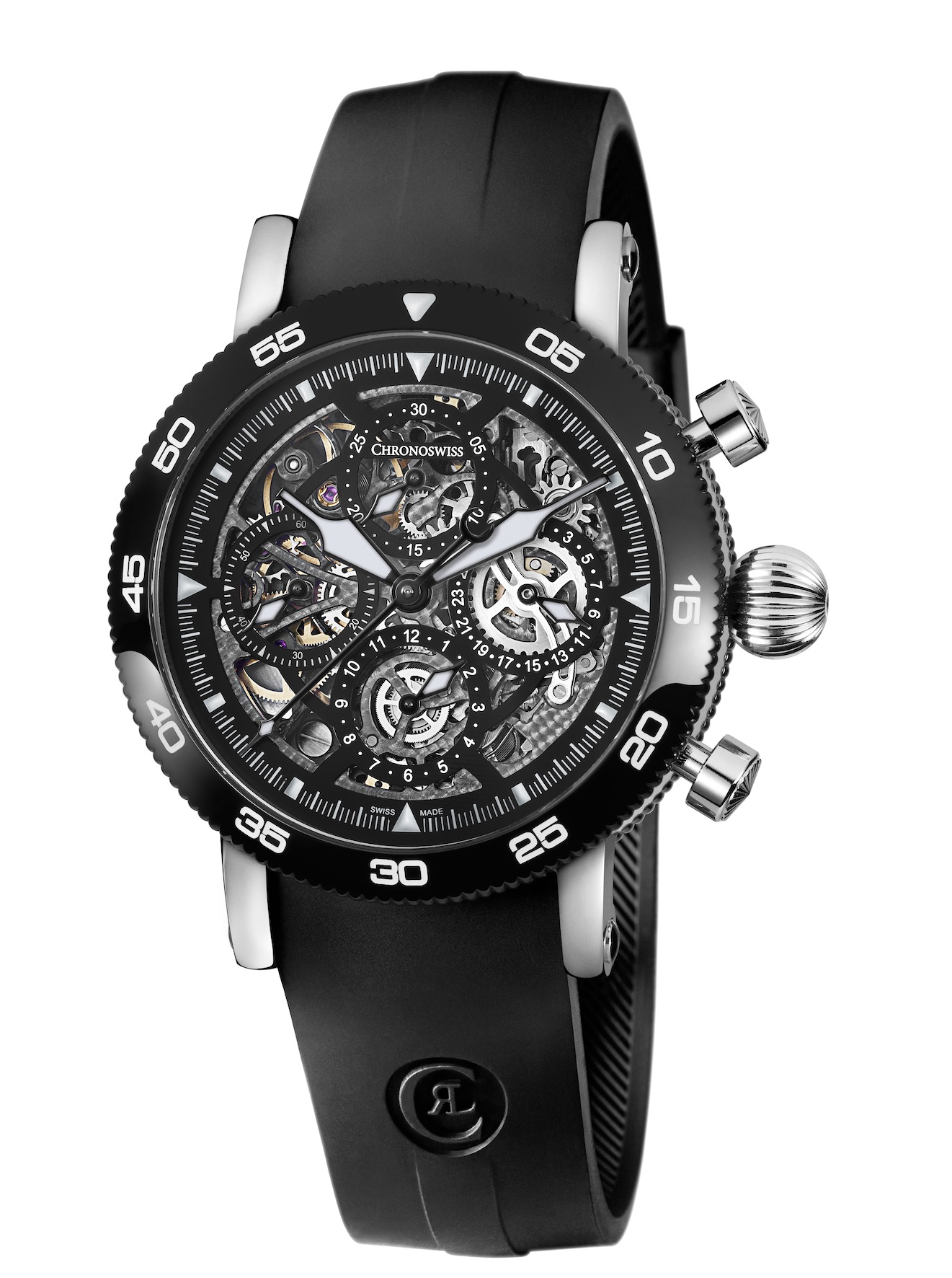 Chronoswiss bietet die Uhr in zwei Varianten an: Mit schwarzem oder galvanisch matt versilbertem Zifferblatt. In beiden Fällen hat das 44 Millimeter messende Edelstahlgehäuse eine Lünette mit stabiler, schwarzer DLC-Beschichtung und besitzt ein Kautschuk-Armband.