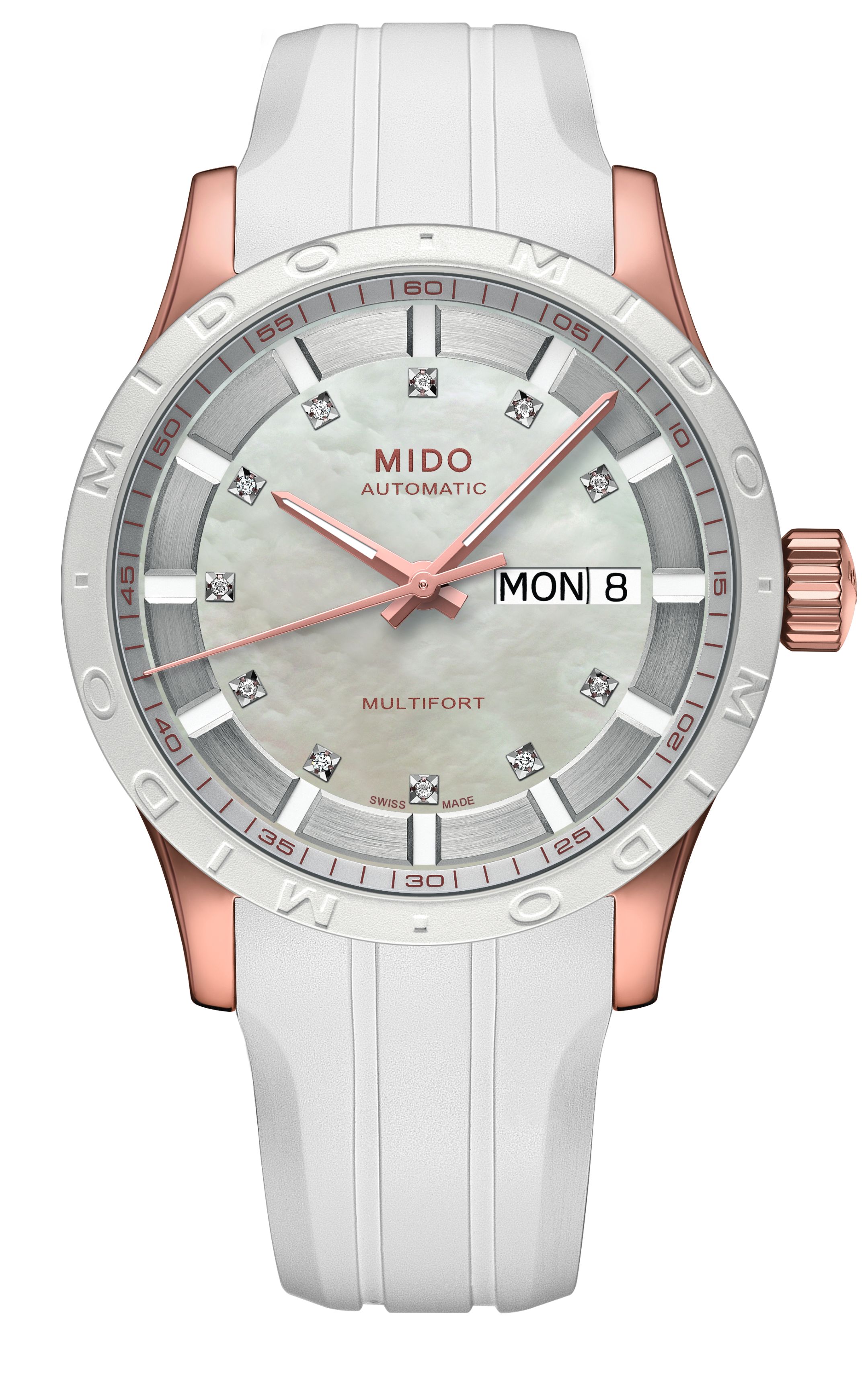 Das 38-Millimeter-Stahlgehäuse mit roségoldfarbener PVD-Beschichtung ist mit einer weißen Kautschuk-Lünette versehen, in die das Wort Mido eingeprägt ist. Das ebenfalls aus weißem Kautschuk bestehende Armband verleiht diesem Modell, genauso wie das Stahlgehäuse mit roségoldfarbener PVD-Beschichtung, einen Hauch von sportlicher Eleganz.