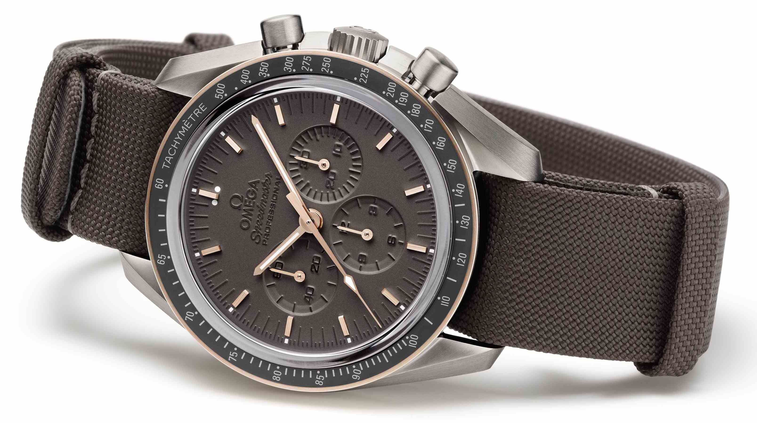 Auch zum 45. Jubiläum der ersten Mondmission gibt es nun eine limitierte Variante, von der passenderweise 1969 Exemplare gefertigt wurden. Das Gehäuse der Speedmaster Apollo 11 45th Anniversary Limited Edition besteht aus leichtem Titan. Das schwarze PVD-beschichteten Zifferblatt wurde mit Laser bearbeitet, so dass beim Namenszug, den Hilfszifferblättern und den Stundenindizes eine markante reliefartige Struktur entstanden ist. Indizes und Zeiger sind ebenso aus Rotgold gefertigt wie die Lünette. Deren Tachymeterskala besteht – typisch für die Speedmaster-Kollektion – aus matter, schwarzer Keramik. Der Zeitmesser kommt an einem braunen Nato-Band und ist wasserdicht bis zu einem Druck von fünf Bar. Um so nahe wie möglich an den Original-Uhren der Astronauten zu bleiben, schlägt im Herzen Speedmaster Edition das Kaliber 1861 mit Handaufzug – ein echtes Augenschmankerl für Uhrenfans. Beim Glas sind die Designer allerdings von der Vorlage abgewichen. Statt des Kunststoffglases kommt nun ein beidseitig entspiegeltes Saphirglas zum Einsatz. Die Uhr hat eine unverbindliche Preisempfehlung von 5700 Euro.