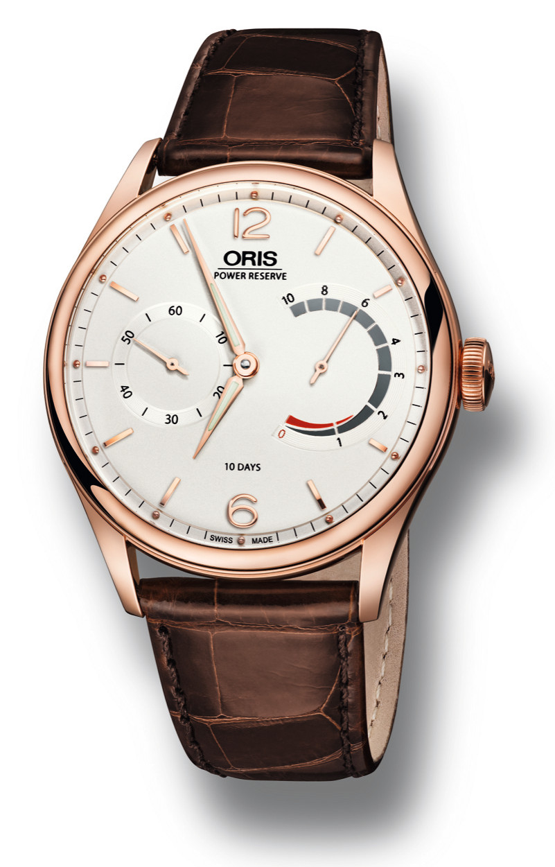 Das Kaliber besticht durch eine beachtliche Zehn-Tage-Gangreserve und eine nichtlineare Anzeige der Gangreserve. Letztere ist patentiert und die Kombination der beiden Komplikationen gab es bisher noch nie gemeinsam in einer Uhr. Um diese Kombination zu realisieren haben die Techniker von Oris über zehn Jahre lang gemeinsam mit Schweizer Ingenieuren und dem „L’École Téchnique Le Locle“ gearbeitet. Das Besondere an der Entwicklung: Anders als bei anderen Uhrwerken mit vergleichbarer Gangreserve, hat Oris nur ein Federhaus im Kaliber integriert. Darin befindet sich eine Zugfeder, die auseinandergezogen eine Länge von 1,8 Metern hat. Diese Feder in ein einziges Federhaus zu bekommen, ohne das Uhrwerk unverhältnismäßig zu vergrößern, war die eigentliche Herausforderung für die Entwickler. Viele Testläufe vor der Lancierung der Uhr haben belegt, dass die Federkraft gleichmäßig über den Zehn-Tage-Zyklus verteilt wird, der Gang also jederzeit stabil ist. Ein Besonderheit ist auch die nichtlineare Gangreserveanzeige: Das Fenster bei drei Uhr zeigt die verbleibende Gangreserve absteigend bis zum Stillstand. Zehn Markierungen stehen auf der Skala für je einen Tag. Zu Beginn der Skala, bei Tag Zehn, sind die Markierungen näher beieinander. Je weniger Tage verbleiben, umso weiter entfernen sie sich voneinander. Die Gangreserveanzeige bewegt sich im Uhrzeigersinn. Zunächst langsam und dann schneller, wenn die Markierungen weiter auseinander stehen.
