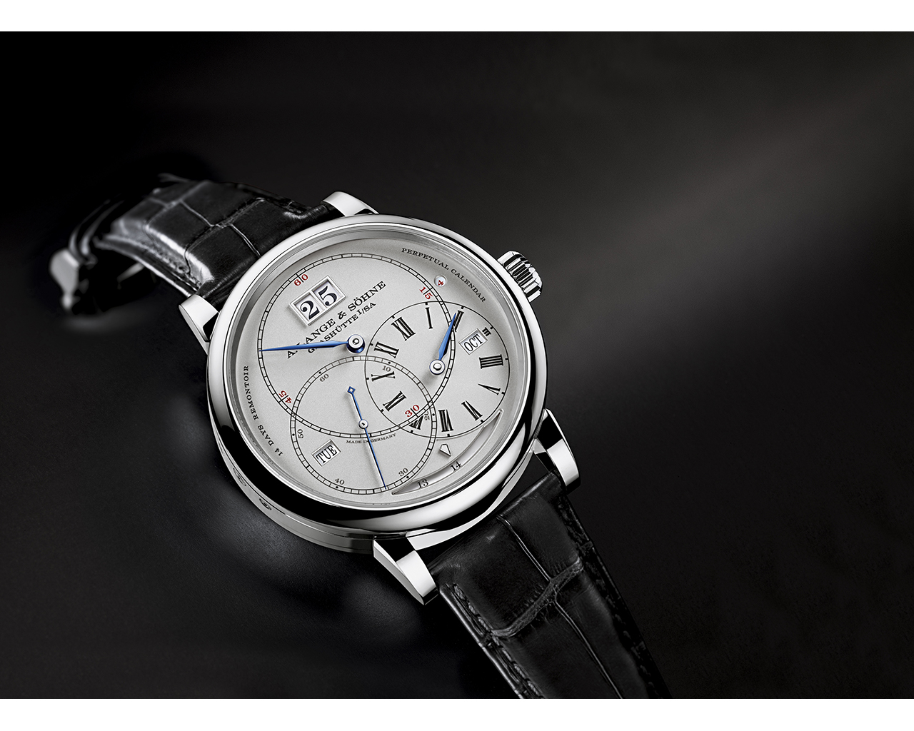 Zugegeben: Auf den ersten Blick ist die Anzeige auf dem Zifferblatt etwas gewöhnungsbedürftig. Ganz oben steht der große Minutenkreis. Darunter befinden sich, nach rechts und links versetzt, die kleineren Zifferblätter für Stunde und Sekunde. Und hier kommen wir zur Historie. Denn die Aufteilung entspricht Johann Heinrich Seyfferts Regulator aus dem Jahr 1807, der in der weltberühmten Uhrensammlung des Mathematisch-Physikalischen Salons in Dresden zu sehen ist. Das charakteristische Großdatum ist bei zwölf Uhr untergebracht. Diese Darstellung des Datums ist für Lange so typisch, dass erwähnt werden muss, das sie hier erstmals in einer Uhr aus der Linie Richard Lange eingesetzt wird. Zwei kleinere Fenster zeigen die Wochentage (links) und Monate (rechts). In einem kleinen runden Fenster rechts neben der 15 des Minutenkreises befindet sich die Schaltjahresanzeige. Alle Kalenderanzeigen schalten sprunghaft weiter und sind so jederzeit eindeutig ablesbar. Um die für den Schaltvorgang benötigte Kraft so gering wie möglich zu halten, wird die notwendige Energie über eine Kurvenscheibe kontinuierlich aufgebaut und um Mitternacht auf einmal freigesetzt. Korrigiert werden muss der Ewiger Kalender im Jahr 2100.