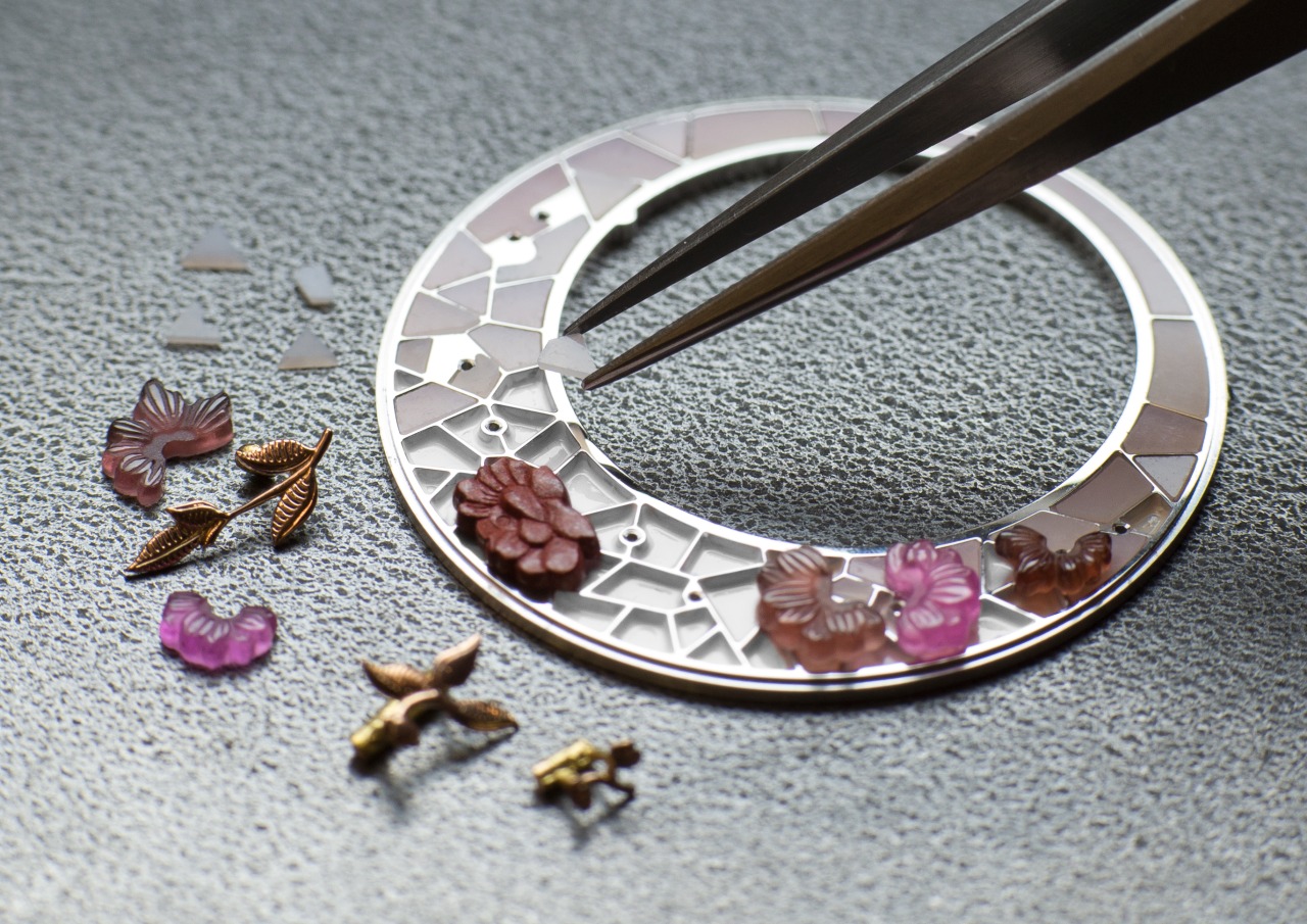 Die besonders feine Gravur der Rubine stellte eine wahre Herausforderung dar, da Rubine sehr harte Steine sind. Die roséfarbenen Opalplättchen wurden einzeln von Hand zugeschnitten und poliert und dann in die durch lediglich 0,5 Millimeter starke Weißgold-Stege getrennten Felder des Zifferblattbodens gesetzt. Mit ihrer meisterhaften Arbeit haben die Steinschneider und Graveure eine beeindruckende Hommage an die traditionelle Stickereikunst geschaffen, die in China seit Jahrtausenden gepflegt wird.