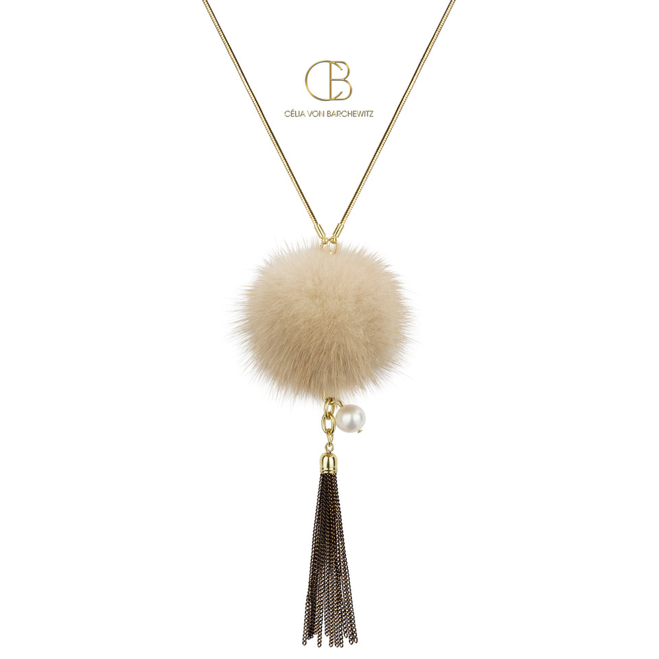 Puschelkette mit Süßwasserzuchtperle und Nerzfell, Metall 18 karat vergoldet, 79 Euro