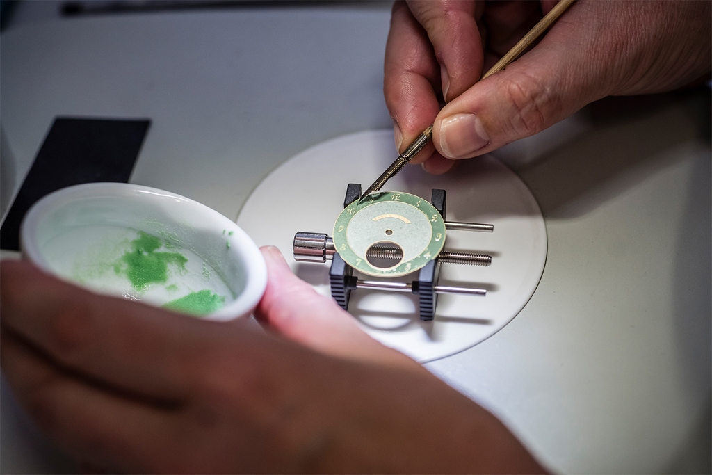 Der Kunde ist König – und das nicht nur, aber vor allem, in der Kurfürsten- und Königsstadt Dresden. Deshalb darf er bei Lang & Heyne seine Vorstellungen und Wünsche nicht nur äußern, sondern bekommt sie auch erfüllt. Aktuelles Beispiel ist die individuelle Sonderanfertigung der Friedrich III für einen Kunden, der ihr den Namen Terra verlieh. Für dieses Einzelstück flossen zeitlose Eleganz und akribische Handwerkskunst ineinander. Während die klassische Friedrich III über ein einfarbiges (silber, schwarz oder royalblau) Zifferblatt mit schlanken römischen Ziffern verfügt, wurde für die Terra ein Blatt aus Emaille in Champlevé-Technik gefertigt, das in drei Jadegrün-Nuancen erscheint – passend zur Krone mit Jadecabochon. Für die Ziffern wurde der Breguet-Stil gewählt. Die Uhr aus 18 karat Roségold wird von einem eigens angefertigten Alligatorlederband in passendem Grünton vollendet – und auch die Lagersteine schimmern in transparentem Grün. Damit auch keine Missverständnisse in Bezug auf die Einzigartigkeit aufkommen, trägt das Caliber VI die Gravuren „pièce unique“ und „Terra“. Der Preis der Indiviualanfertigung wurde nicht bekannt gegeben, aber das soll euch nicht davon abhalten, von einer eigenen Uhr zu träumen und schon einmal die Sonderwünsche zu notieren…