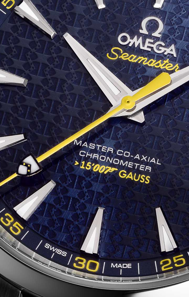 Passend dazu gibt es bereits jetzt eine Sonderedition der Seamaster Aqua Terra 150 M, in deren Design das Familienwappen der Bonds aufgegriffen wurde. Das Symbol bedeckt – immer wieder ineinander verflochten – das blaue Zifferblatt und bildet zudem die Spitze des gelben Sekundenzeigers. Im 41,5 Millimeter messenden Stahlgehäuse arbeitet das Co-Axial-Kaliber 8507. Dessen Aufzugsrotor ist in Form jenes Pistolenlaufs gehalten, den man vom Anfang – beziehungsweise vom Ende – der Bond-Filme kennt. Das Werk ist gegenüber Magnetfeldern weitgehend unempfindlich: 15 007 (sic!) Gauß gibt Omega hier als maximalen Wert der magnetischen Flussdichte an, die diese Uhr überstehen kann. Das entspricht ungefähr dem 150-fachen eines Magneten einer Kühlschranktür. Produziert wird die Uhr in einer Stückzahl von 15 007 (sic! sic!) Exemplaren. Sammelnde Bondfans bekommen die Uhr für 5750 Euro.