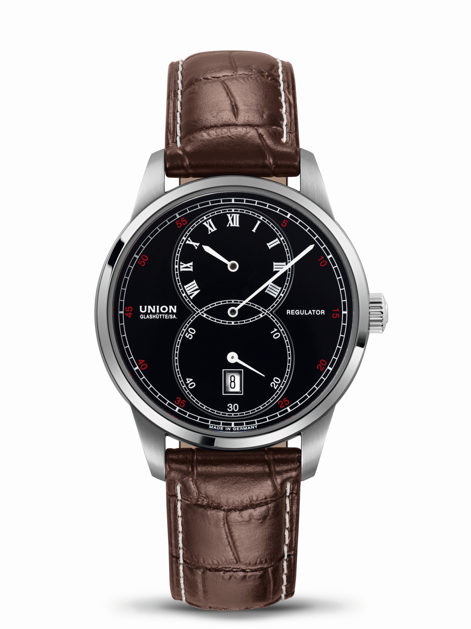 Zumal, wenn diese so schön gewandet daher kommen, wie der 1893 Regulator von Union Glashütte. Auf dem Hauptzifferblatt werden nur die Minuten anhand einer Bahngleis-Einteilung mit roten Ziffern angezeigt. Für letztere standen einige historische Union Taschenuhren Pate. Die Stunden werden separat im oberen Zifferblattbereich angezeigt und sind mit römischen Ziffern markiert. Die Sekundenanzeige ist im unteren Bereich des Hauptzifferblattes platziert. Hier befindet sich zudem eine Datumsanzeige bei 6 Uhr.