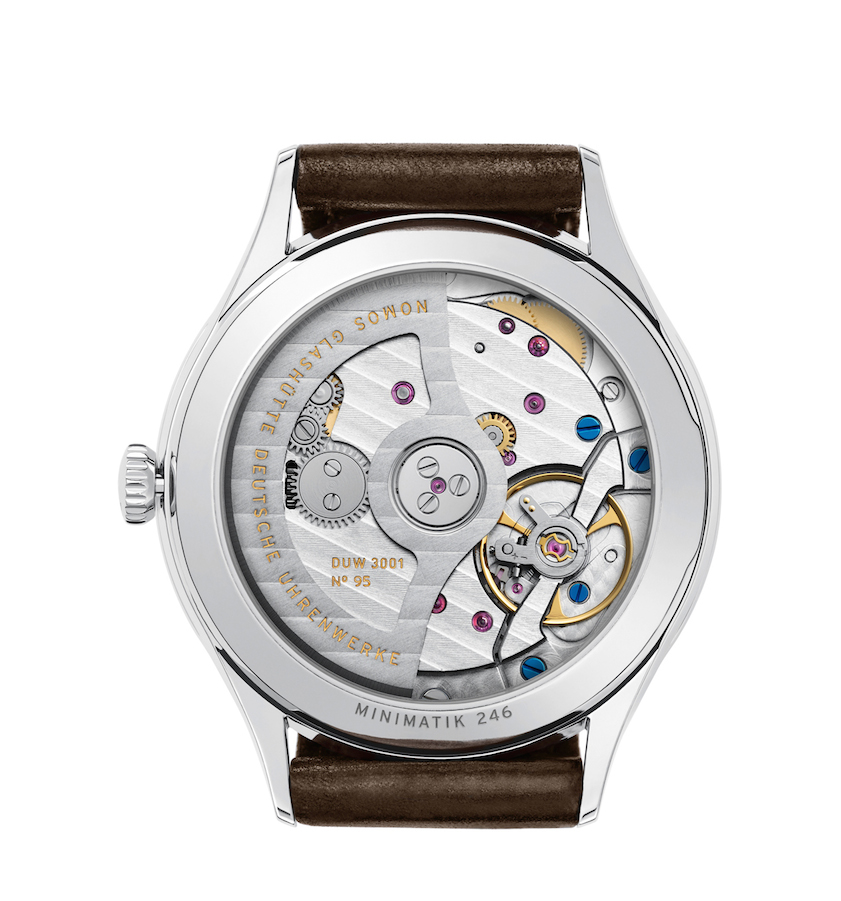 Ein Detail auf dem Zifferblatt darf an dieser Stelle nicht unerwähnt bleiben: Denn der Schriftzug „Automatik“ verweist auf das besondere Innenleben der Minimatik. Denn mit dem Kaliber DUW 3001 arbeitet hier die jüngste Innovation der Glashütter Manufaktur. Nur 3,2 Millimeter hoch ist der neue Motor, der hier seine Premiere hat. Der Blick durch den serienmäßigen Saphirglasboden fällt auf eine Dreiviertelplatine, womit sich das Werk eine Glashütter Tradition aufnimmt. Die Oberflächen sind rhodiniert und werden mit Streifenschliff und einer Perlage verziert. Die Gangautonomie wird von Nomos mit absolut ausreichenden 42 Stunden angegeben.